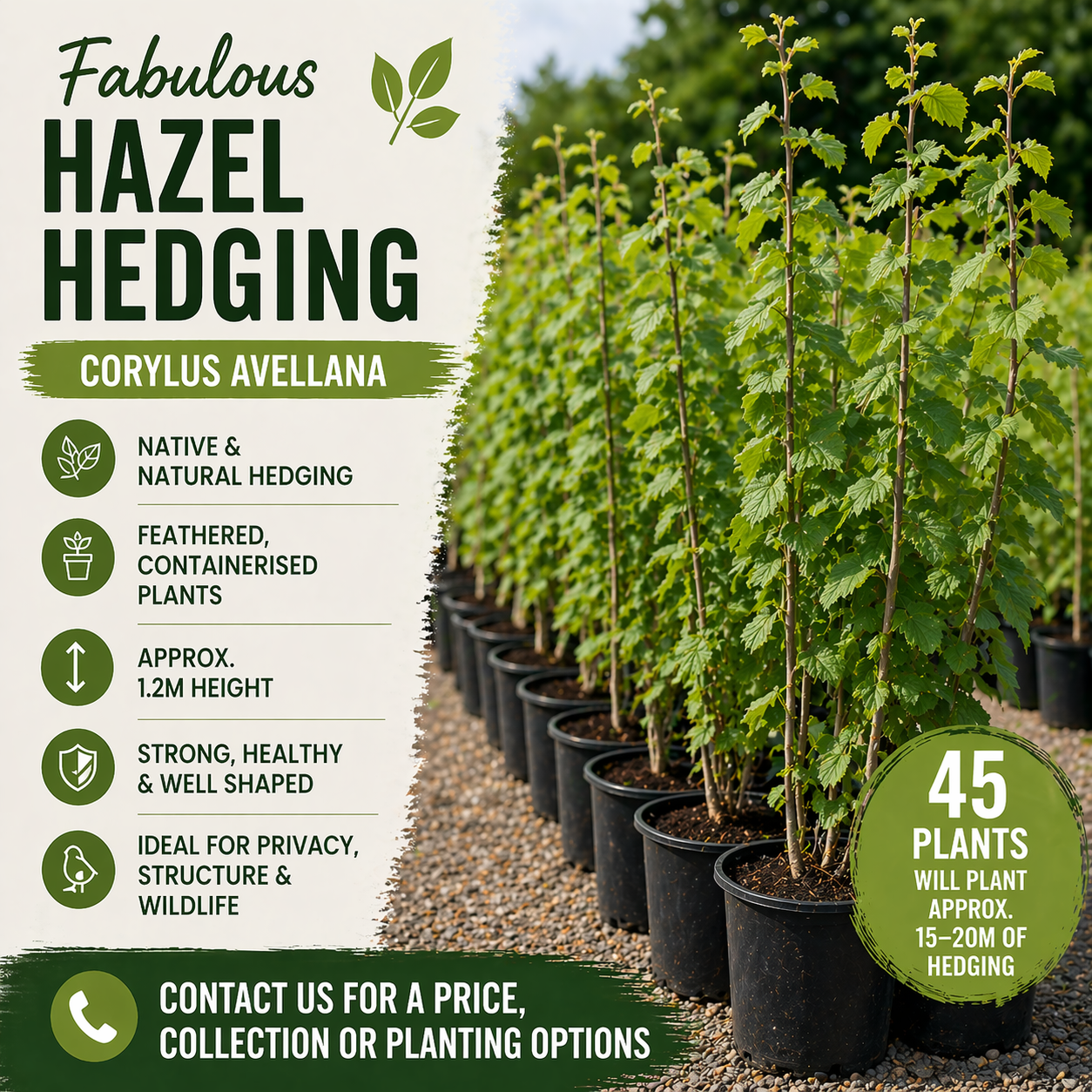 We have 45 Corylus avellana (hazel) plants available — an excellent choice for creating a natural, attractive hedge.